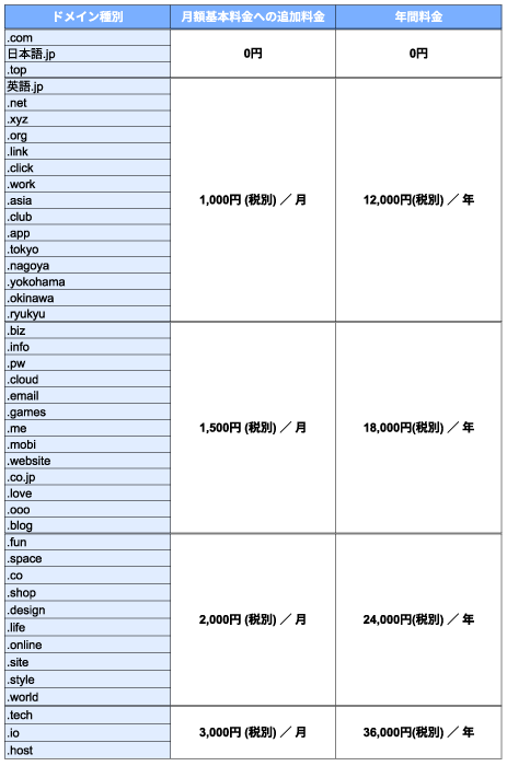 | ドメイン | コミコミ ※1 | 別料金 | 別料金の場合が多い |